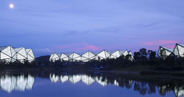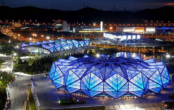 深圳大運中心體育場館率先在國內體育場館建設中引入以聚碳酸酯板(PC板)作為屋面材料面板,PC板是一種科技循環利用的高新低碳環保材料,相同厚度只有普通玻璃重量的50%,隔熱性能比普通玻璃提高了25%,沖擊強度時普通玻璃的250倍,并具有良好的透光性、抗沖擊性及耐紫外線輻射性能,同時還具有良好的尺寸穩定性和成型加工系能。