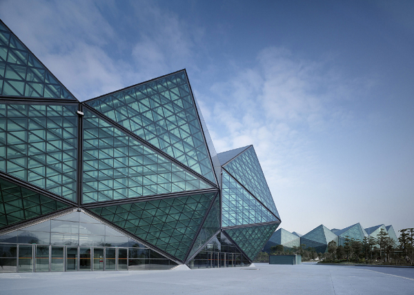 深圳大運中心體育館鋼結構屋蓋集高聳結構和大跨度空間結構于一體,由16個形狀相近的鋼結構單元構成,直徑達158米,工程用鋼量約5800噸。項目外圍護結構系統(屋面結構系統與立面幕墻系統)總面積3.3萬平方米,由三角形鋼架、聚碳酸酯板和鋼化夾膠玻璃共同組成“水晶石”造型,內層采用玻璃纖維張拉膜。其中屋面結構系統由224根三角形鋼架做骨架、7776塊9393平方米的聚碳酸酯板(PC板)、10358塊17471平方米的XIR膜夾膠鋼化玻璃、6439平方米的“W”形鋁板天溝和624個自然通風及48個機械通風百葉組成。立面幕墻系統由144根鋼立柱組成受力支撐骨架,由2727平方米的中空LOW-E鋼化玻璃和64檔平開門組成。