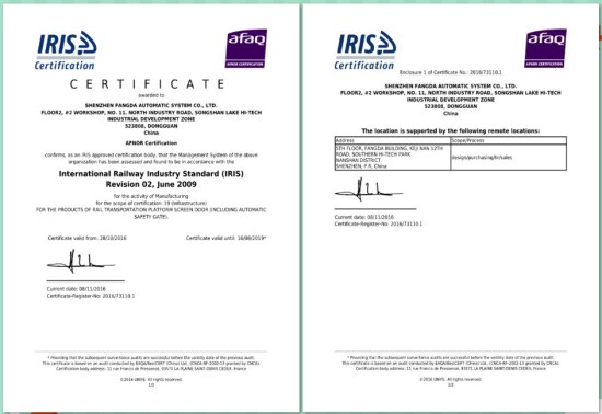 深圳市方大自動化系統有限公司作為全球最大的軌道交通屏蔽門系統供應商,導入IRIS經營管理體系是公司與世界先進管理方法接軌的必要舉措。IRIS管理體系認證證書的獲得,是獨立的第三方機構對方大自動化公司的管理體系符合國際鐵路行業統一規范標準的認可。通過IRIS經營管理體系認證,意味著方大自動化公司的管理體系接軌世界先進管理方法,在ISO9000基礎上進一步提升企業的整體管理水平。在取得IRIS管理體系認證證書后,方大自動化公司的相關認證信息將由IRIS管理中心錄入IRIS門戶網站認證信息庫進行統一管理,同時可供全球鐵路行業客戶進行檢索、瀏覽,這為方大自動化公司拓展市場領域、獲取更多的國際訂單提供了強有力的保障。