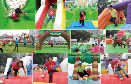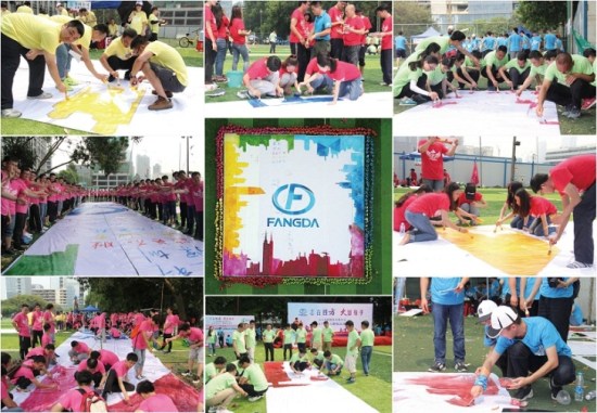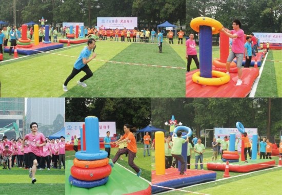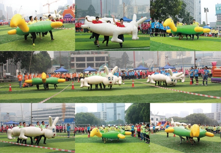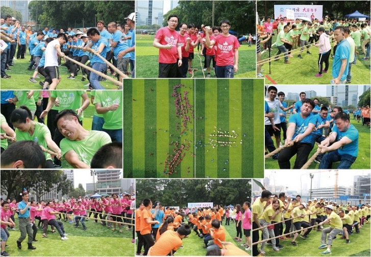 本次運動會設置了龜兔賽跑、超級漢諾塔、快樂gogogo、趣味拔河、納斯卡巨畫等趣味項目,比賽場上處處充滿著歡聲笑語,大家玩得不亦樂乎!在龜兔賽跑環節,各代表隊的隊員們分別頂著巨型充氣“烏龜”、“兔子”笑著跑著,奮力競爭,爭取最好的比賽成績;在超級漢諾塔環節,考驗的不僅有團隊成員的運動能力,還有團隊內部的組織協作效率;在快樂gogogo環節,更是掀起了所有參賽員工的火熱激情,他們在氣墊城堡中穿梭、攀爬、滑行、滾動,在回味和體驗孩童時代樂趣的同時,為自己的團隊爭取好的名次;趣味拔河環節是這次運動會的最高潮,只見加油的叫喊聲震天動地,拔河的隊員無不神態激越,使出渾身之力,將拔河繩拉得吱吱地響;最后是納斯卡巨畫環節,參與運動會的全體員工一同用五顏六色的油彩,分工合作,共同繪出印有方大集團logo的巨型圖畫。通過百米高空上無人機的航拍我們看到,在530余名方大人簇擁中的方大logo巨畫,在燦爛陽光的照耀下,正閃閃發光,正如她在行業中的響亮知名度一樣。