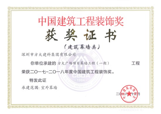 中國(guó)建筑工程裝飾獎(jiǎng)是由中國(guó)建筑裝飾協(xié)會(huì)主辦的評(píng)選活動(dòng),自2001年起每年進(jìn)行評(píng)選,是建設(shè)部批準(zhǔn)設(shè)立的中國(guó)建筑裝飾行業(yè)的最高榮譽(yù)獎(jiǎng)。方大建科承建的四項(xiàng)幕墻工程獲此獎(jiǎng)項(xiàng),是對(duì)公司精湛的幕墻設(shè)計(jì)能力和先進(jìn)的施工工藝的充分肯定。