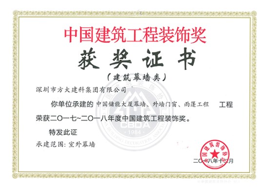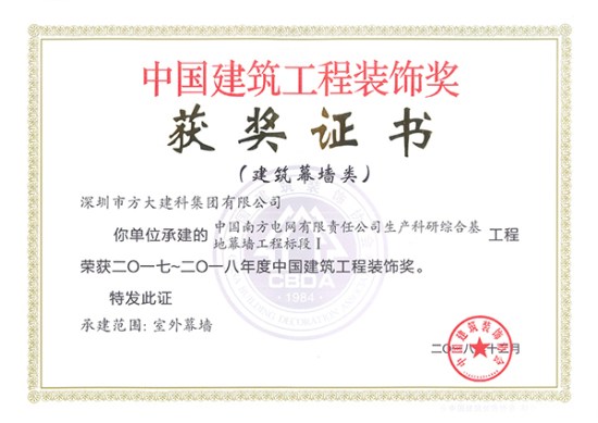 近日,中國(guó)建筑裝飾協(xié)會(huì)頒發(fā)了2017-2018年度中國(guó)建筑工程裝飾獎(jiǎng)的獲獎(jiǎng)證書(shū),方大集團(tuán)股份有限公司全資子公司深圳市方大建科集團(tuán)有限公司承建的四項(xiàng)幕墻工程榮獲中國(guó)建筑工程裝飾獎(jiǎng)——方大廣場(chǎng)(一期)、深業(yè)上城(南區(qū))塔2、中國(guó)儲(chǔ)能大廈、中國(guó)南方電網(wǎng)有限責(zé)任公司生產(chǎn)科研綜合基地。