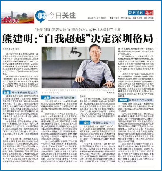 7月29日,深圳商報刊發熊建明董事長專訪《熊建明:“自我超越”決定深圳格局》