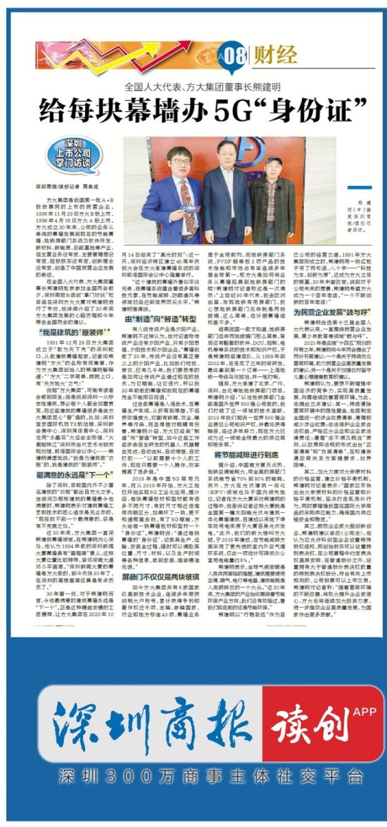 這30年來,方大集團一直深耕建筑幕墻領域。在熊建明內心深處,他認為1994年做的深圳新聞大廈幕墻具有“里程碑”意義。這棟大廈位置比較特殊,緊鄰深南大道鄧小平畫像。“深圳新聞大廈的幕墻是方大做的,到今天快30年了,在深圳的高樓里面還算是有點歷史了。”